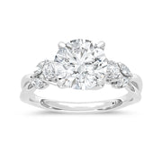 This 14K white gold engagement ring centers a 2.00 ct round lab-grown diamond, complemented by six marquise and round accent stones for added dimension. With a total weight of 2.33 ctw and a prong setting designed to maximize light, the piece offers contemporary brilliance with a transparent, conflict-free provenance.