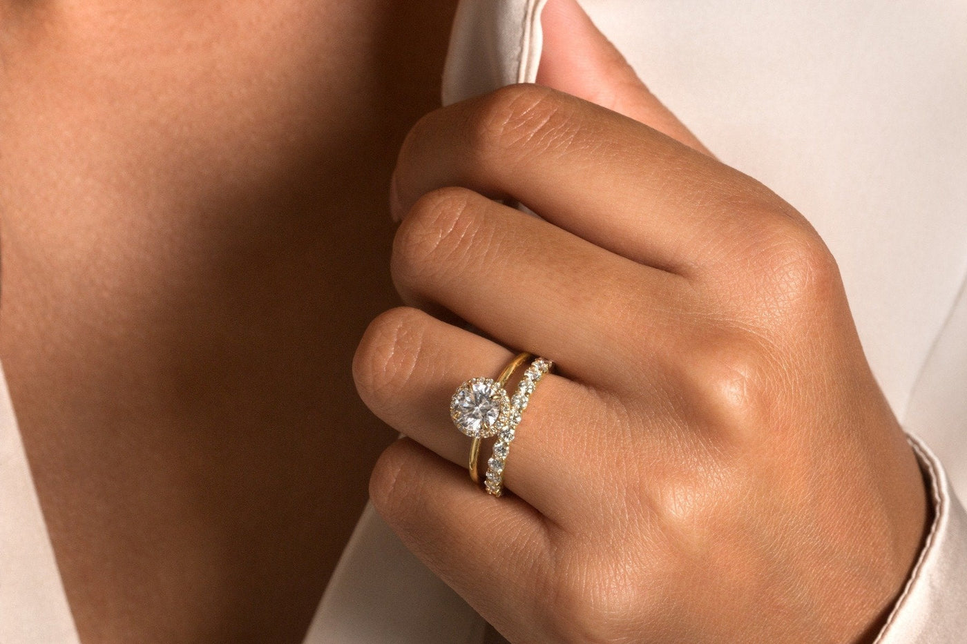 Discover timeless elegance with this exquisite 18K sustainable gold halo ring, meticulously crafted for the discerning buyer.