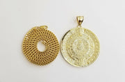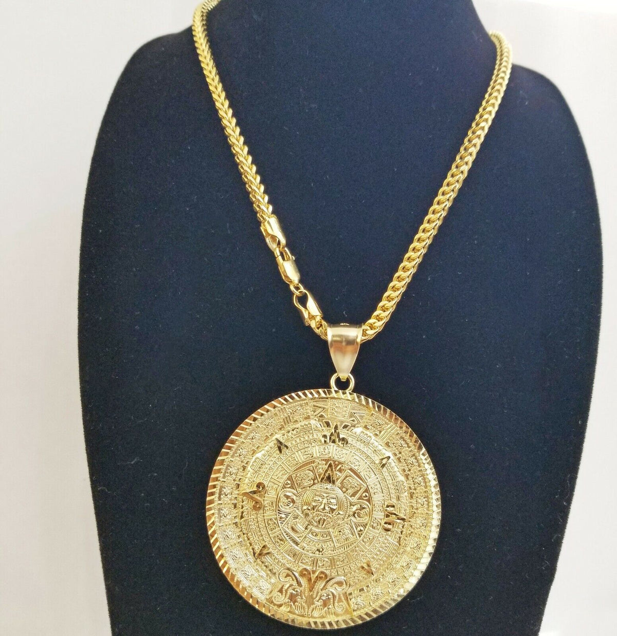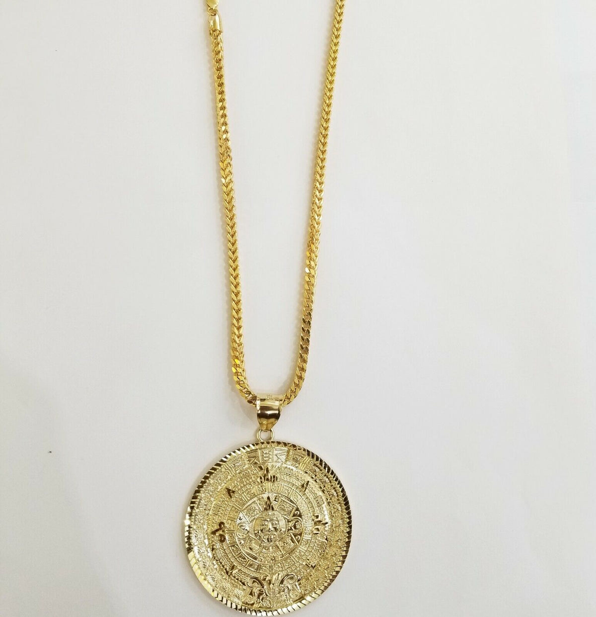 10k Real Gold Aztec Calendar Pendant Charm 3mm 20" 22" 24" Franco Chain