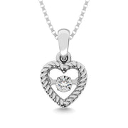 Celebrate this valentine?s with this romantic diamond heart pendant. Expertly crafted in sleek sterling silver. At the center of the style, a single diamond accent shimmers in a unique setting that moves with every beat of her heart and every turn of her head. The shimmering pendant suspended with 18 inch rope chain that secures with a spring-ring clasp.